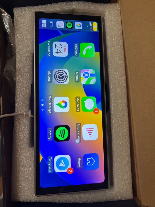 - Incluye aplicaciones como Calendario, Teléfono, Ajustes, Mapas, Mensajes, Spotify y Telegram.
