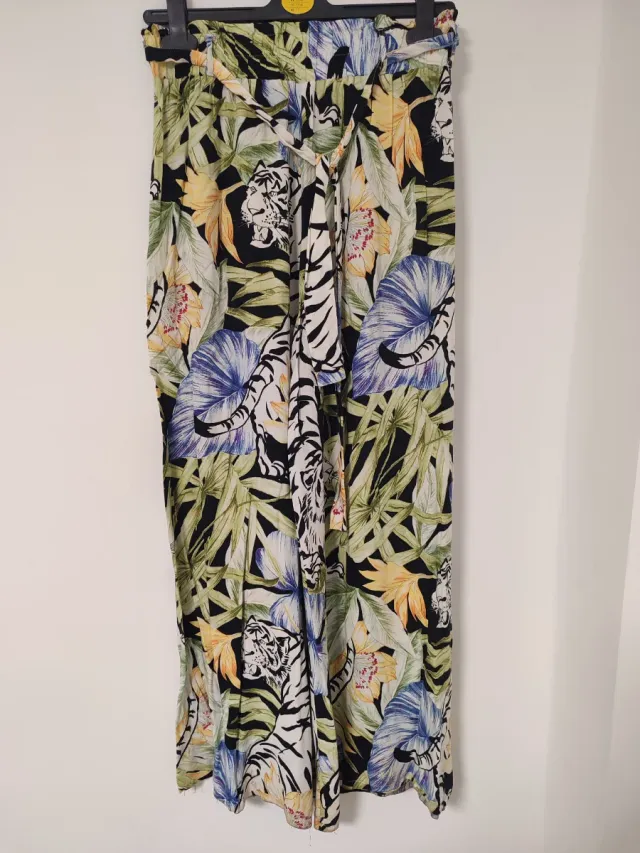 Pantalón ancho con un llamativo estampado tropical y de tigres. Perfecto para un look veraniego y atrevido.