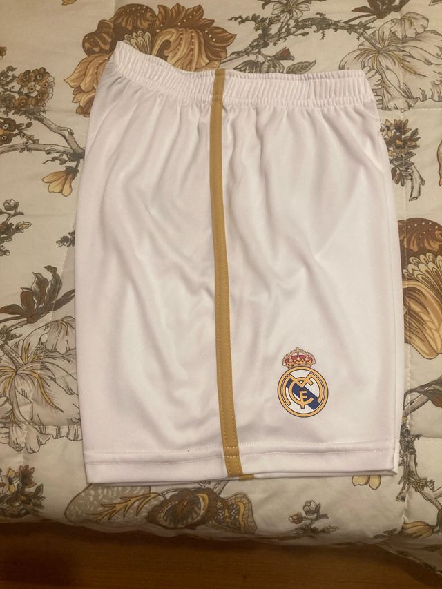 Pantalón corto deportivo del Real Madrid.Apenas usado por talla pequeña. - Color blanco con detalles dorados. - Escudo del equipo bordado.