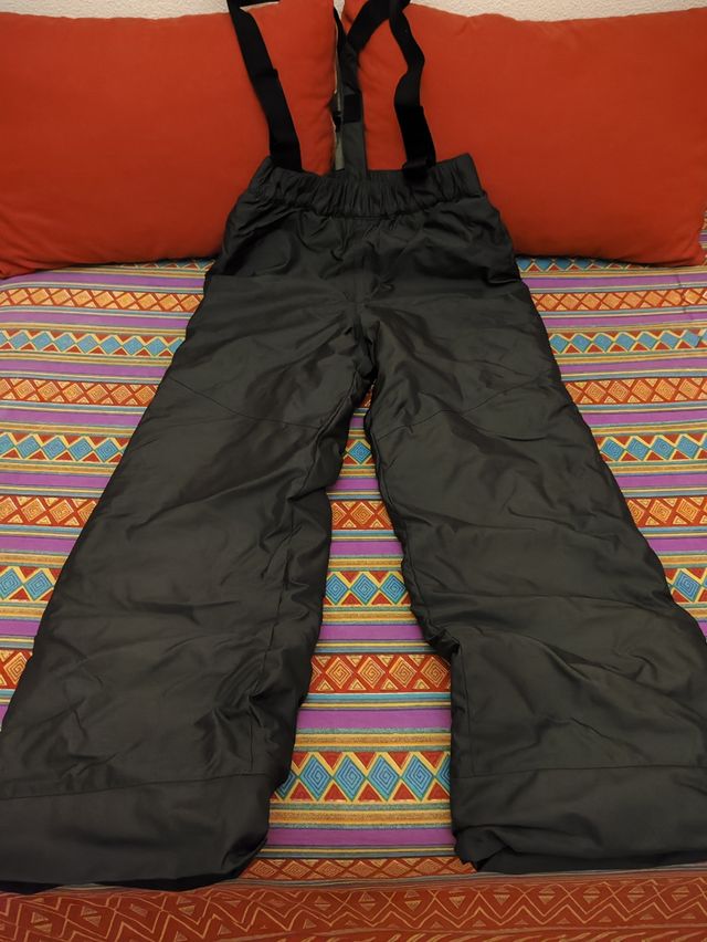Detalles del productoPantalón de nieve negro con tirantes, ideal para esquiar. Y Chaqueta para esquiar con cierre. No se vende por separado. Para niños/as edad 12 años.