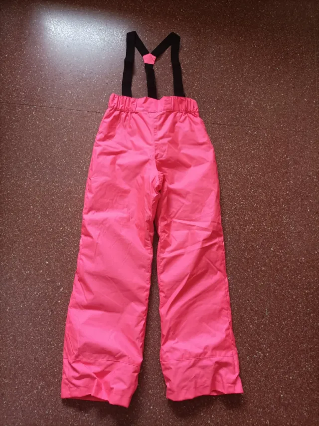 Detalles del productoPantalón de esquí de color rosa brillante, con tirantes negros ajustables. Ideal para disfrutar de la nieve con comodidad y estilo.