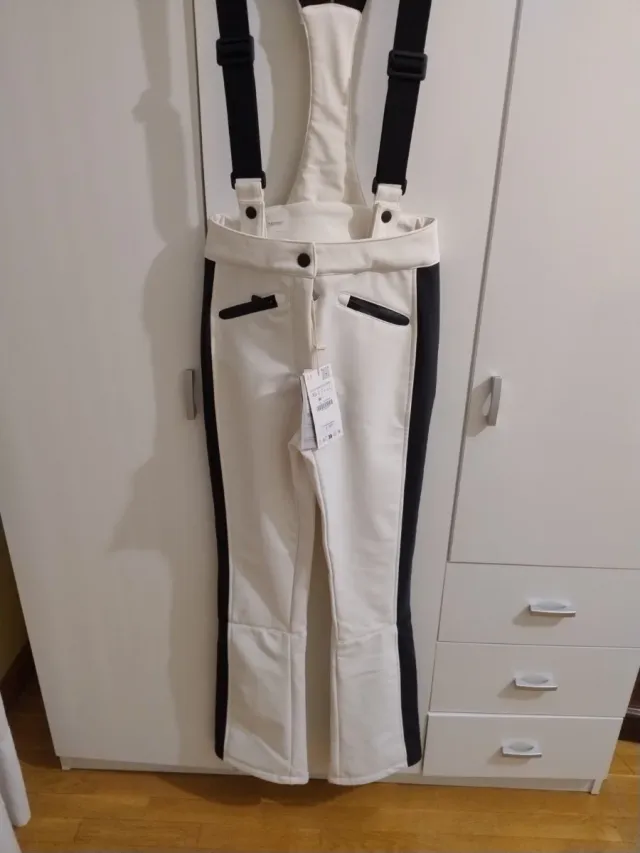 Pantalón de esquí de la colección de Zara. Con tirantes y tecnología Recco - Color blanco con detalles laterales en negro. - Talla XS.