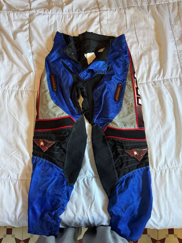 Detalles del productoPantalón de moto con diseño deportivo en colores azul, negro y gris. Presenta detalles en rojo y parches decorativos.