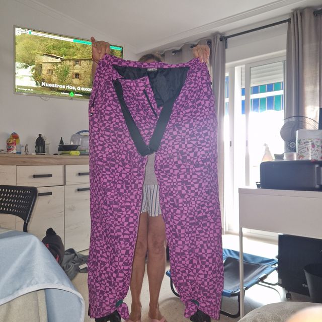 Detalles del productoPantalón de nieve con un llamativo estampado geométrico en morado y negro. Ideal para actividades al aire libre en climas fríos.