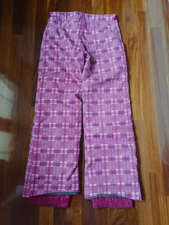 Detalles del productoPantalón de nieve con un diseño a cuadros en tonos morados y blancos. Ideal para actividades invernales.