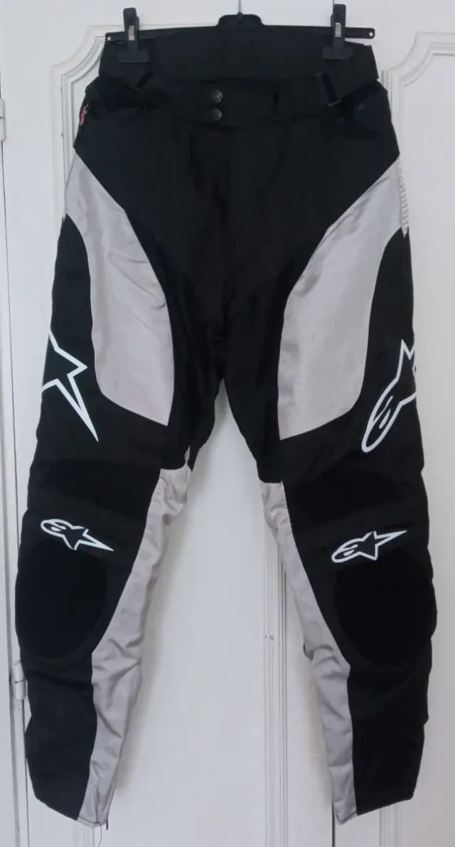 Pantalón técnico de moto nuevo sin estrenar, con diseño deportivo negro y gris y protecciones extraíbles en rodillas y caderas.