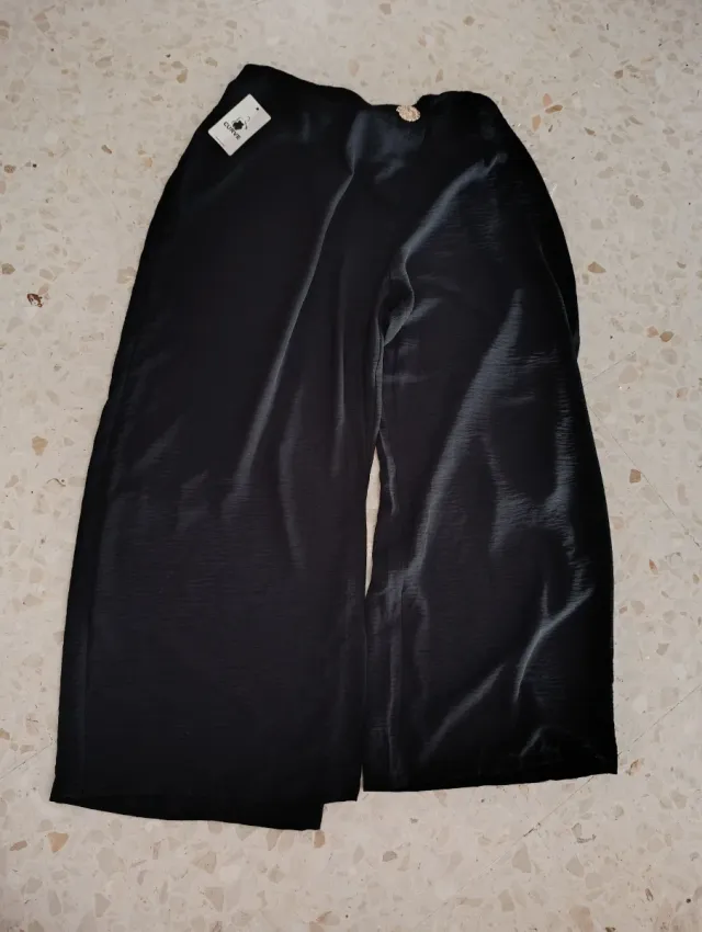 Pantalón negro de corte ancho, ideal para un look elegante y cómodo. - Talla 48/50. - Tejido con textura satinada. - Detalle de botón dorado en la cintura.