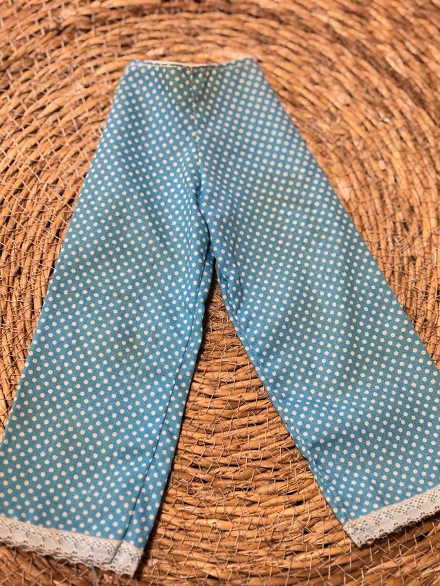 Pantalón de pijama para muñeca Nancy de Famosa. Con un divertido estampado de lunares blancos sobre fondo azul. - Estampado de lunares. - Detalle de encaje en los bajos.