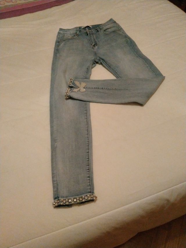 Pantalon vaquero elastico con pedrería en bajos