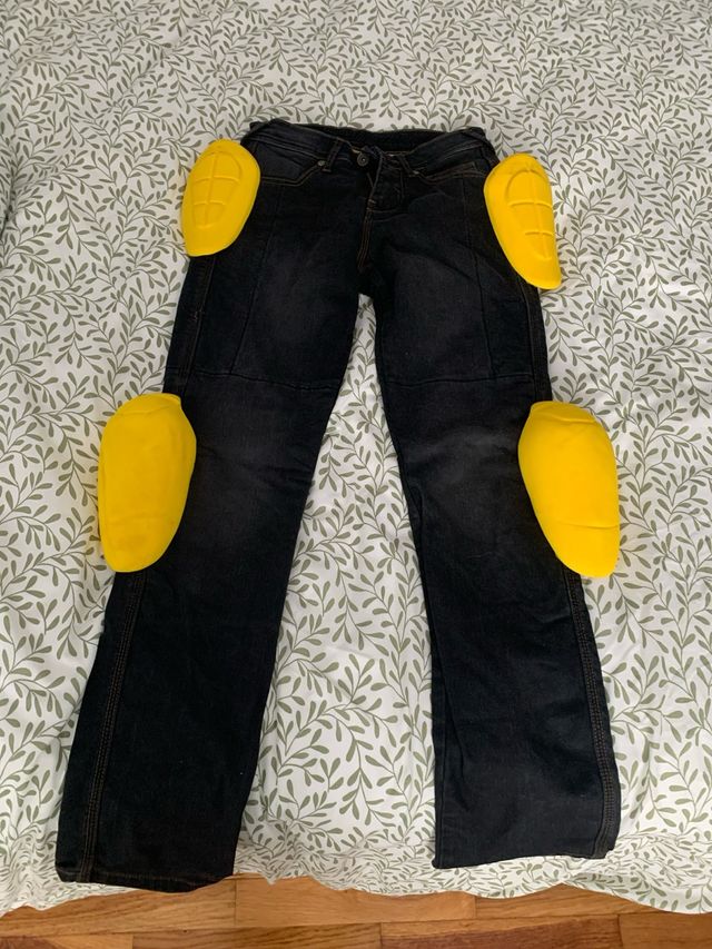 Pantalón vaquero de moto para mujer en color negro. Incluye protecciones en cadera y rodillas extraíbles. Talla xs. Marca Seventy-Degrees.