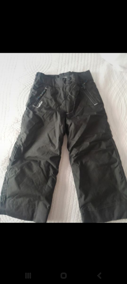 Pantalones de nieve oscuros, ideales para actividades al aire libre. - Cremalleras en los bolsillos. - Costuras blancas decorativas.