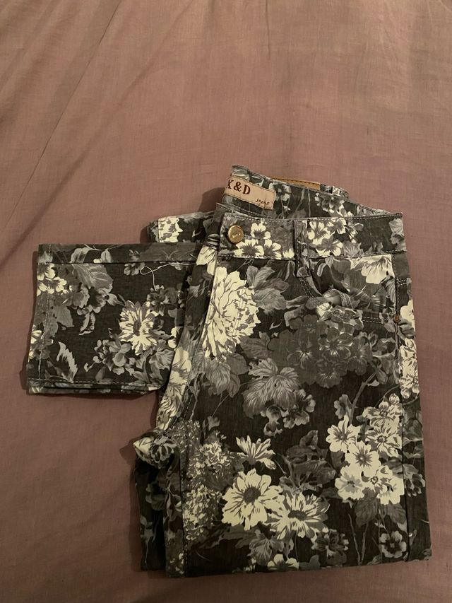 Pantalones K&D Estampado Floral Gris y Blanco