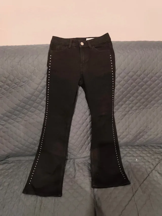 Pantalones vaqueros negros sin estrenar, con detalle de tachuelas a los lados. - Talla 11-12. - Diseño acampanado. - Tachuelas plateadas decorativas.