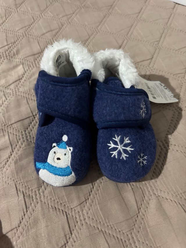 Detalles del productoPantuflas de bebé de color azul marino, perfectas para el invierno. Tienen un diseño tierno de oso polar con gorro y bufanda en el exterior.