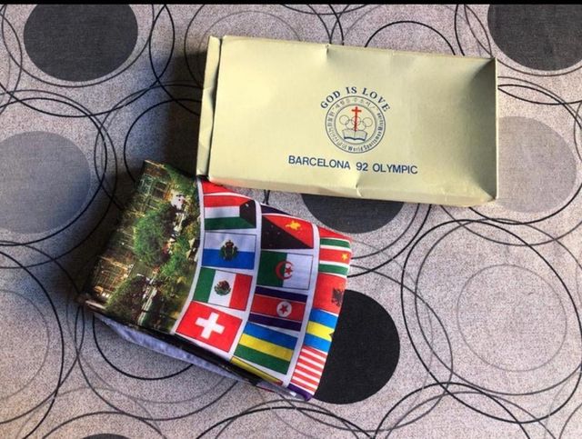 Pañuelo de seda de las olimpiadas en España, con todas las banderas de los países 🦋que participaron en ellas, y con descripciones en todos los idiomas.