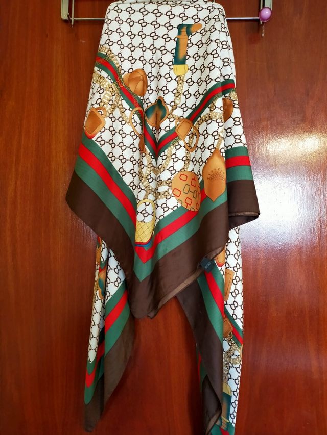 Pañuelo cuadrado de seda vintage estilo Gucci en colores marrón, rojo, verde y blanco.