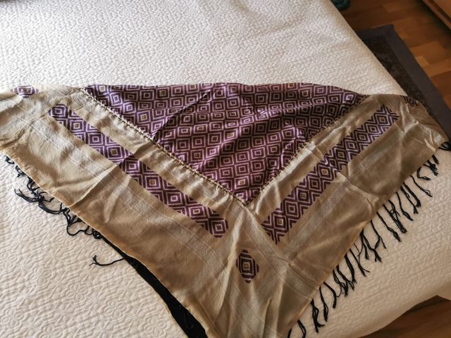 Pañuelo cuadrado de dos caras: seda estampada en morado y lana azul marino. Con flecos en los extremos.
