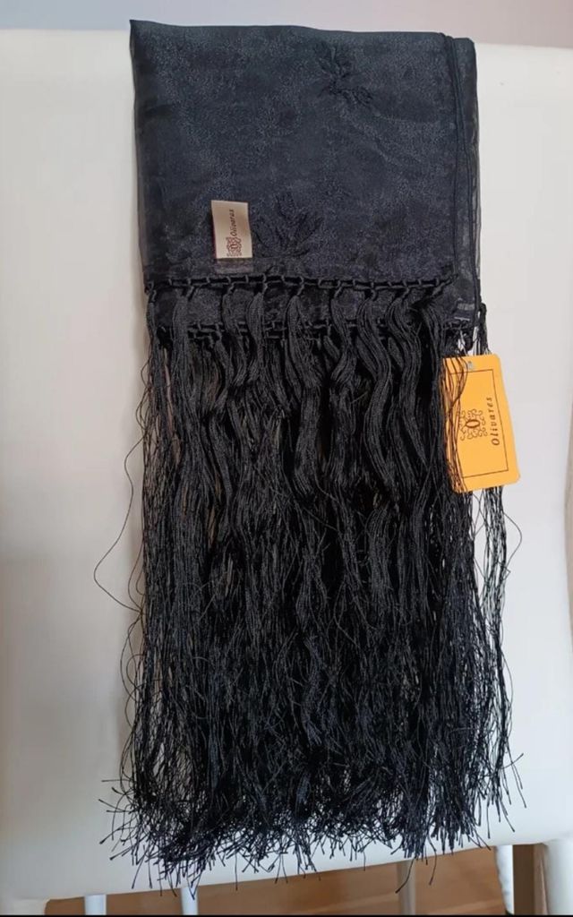Echarpe, chal o foular negro con flores negras bordadas y flecos hechos a mano, firma Olivares. Comprado en el corte inglés.