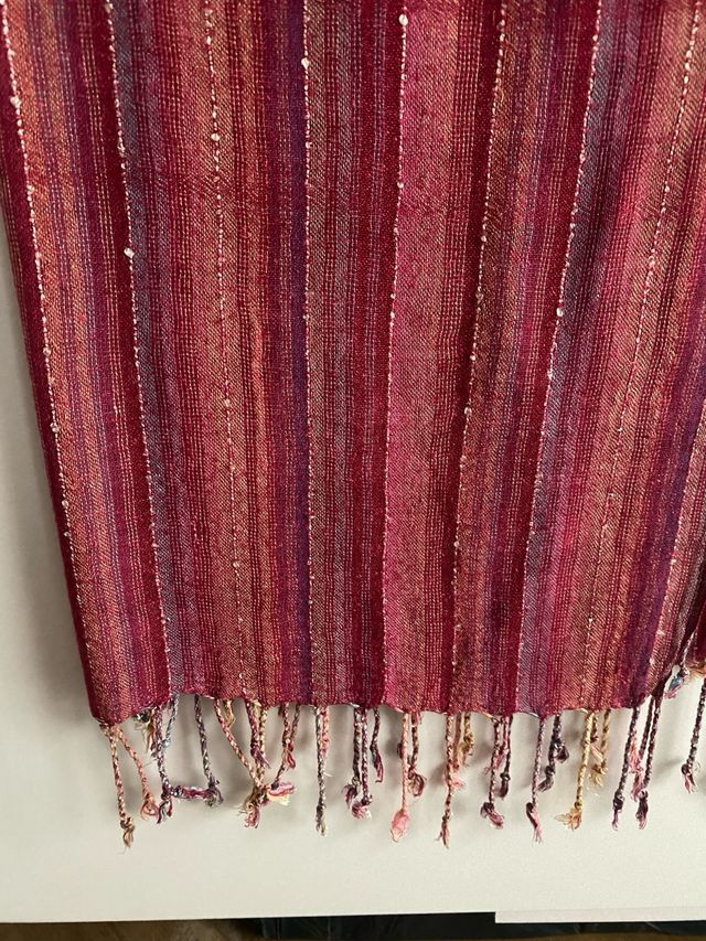 Pañuelo pasmina en tonos rojo burdeos frambuesa etc. En buen estado. Con flecos. Medidas: de largo:175 cm; de ancho: 63 cm