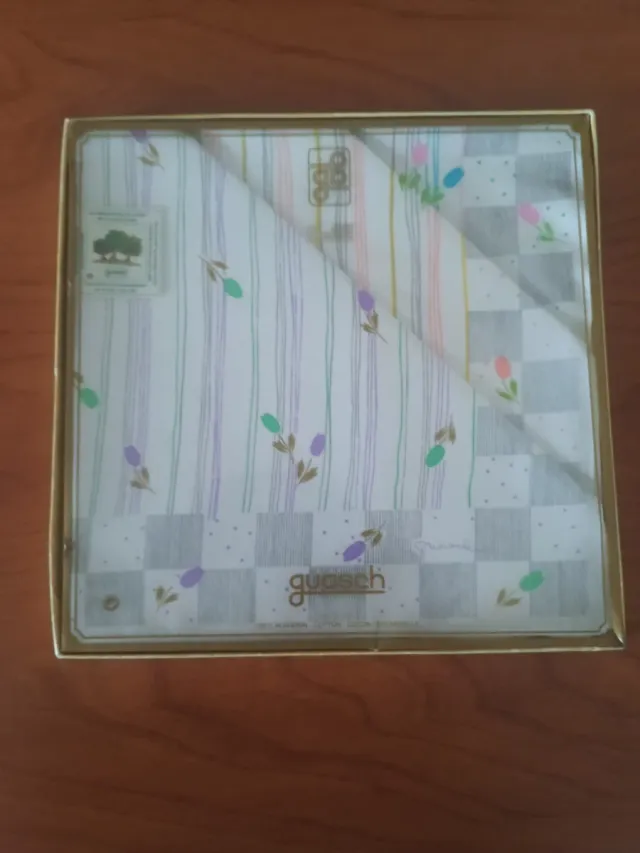 Detalles del productoElegantes pañuelos de algodón de la marca Guasch. Presentados en su caja original.