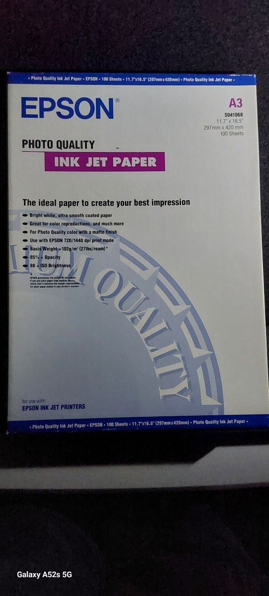 Detalles del productoVendo papel fotográfico Epson Inkjet, tamaño A3, modelo S041068. Es un paquete nuevo y sellado.