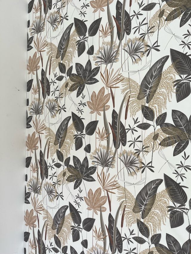 Rollo empezado de papel pintado con un diseño botánico en tonos tierra y grises. - Diseño de hojas y cañas. - 7 metros lineales + retales