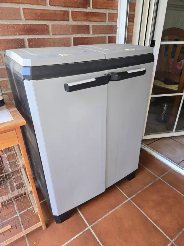 Conjunto de papeleras de reciclaje con una mesa auxiliar. - Papeleras de plástico gris y negro. - Mesa auxiliar de madera.