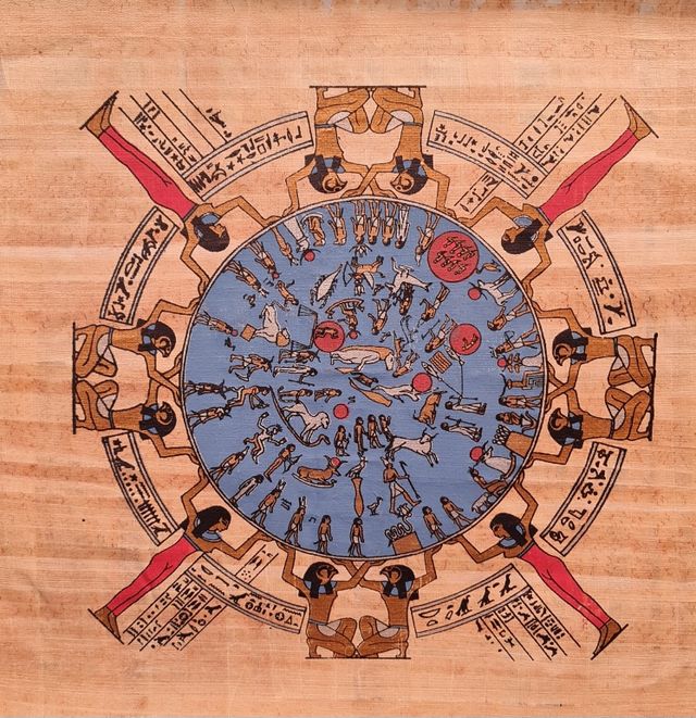 Papiro Egipcio del Zodiaco de Dendera de los años 50s, de 40 cm de ancho por 33 cm de altura, con certificado de garantía de Karnak Papyrus Gallery.