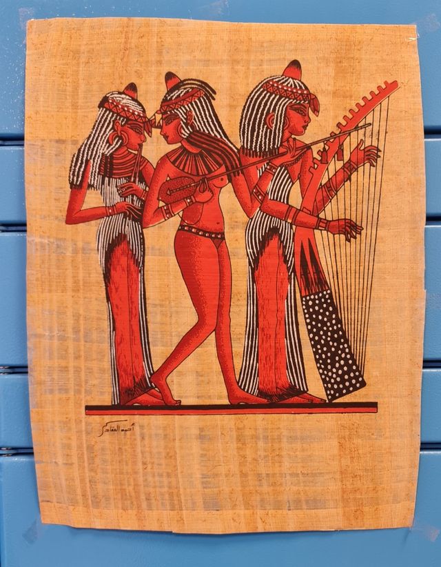 Papiro Egipcio "Musicos de Amon" de los años 50s, de 40 cm de ancho por 33 cm de altura, con certificado de garantía de Karnak Papyrus Gallery.