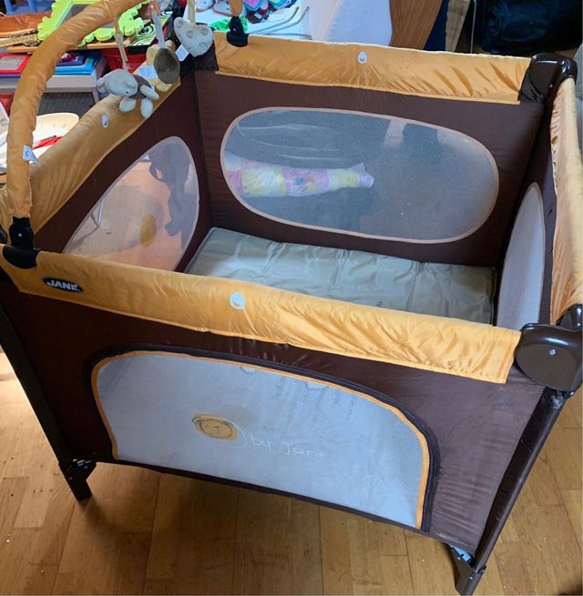 Detalles del productoparque o cuna de viaje jane sin apenas uso, facil de montar y de desmontar, mide 1mx1m asi q es ideal para gemelos tambien. Medidas del producto