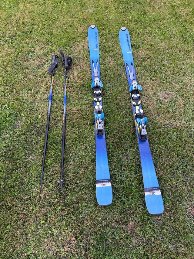 Par de esquís Salomon en color azul, con un diseño degradado. - Esquís de esquí alpino. - Fijaciones Salomon incluidas. - Bastones de esquí a juego.
