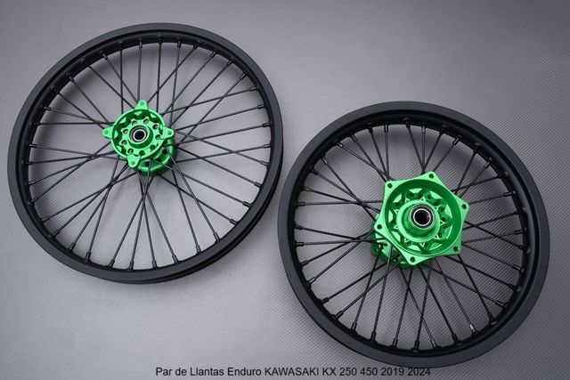 Detalles del productoPar de Llantas / Ruedas delantera y trasera con radios Enduro 1.6 x 21 / 2.15 x 18 específica para las siguientes motos KAWASAKI :