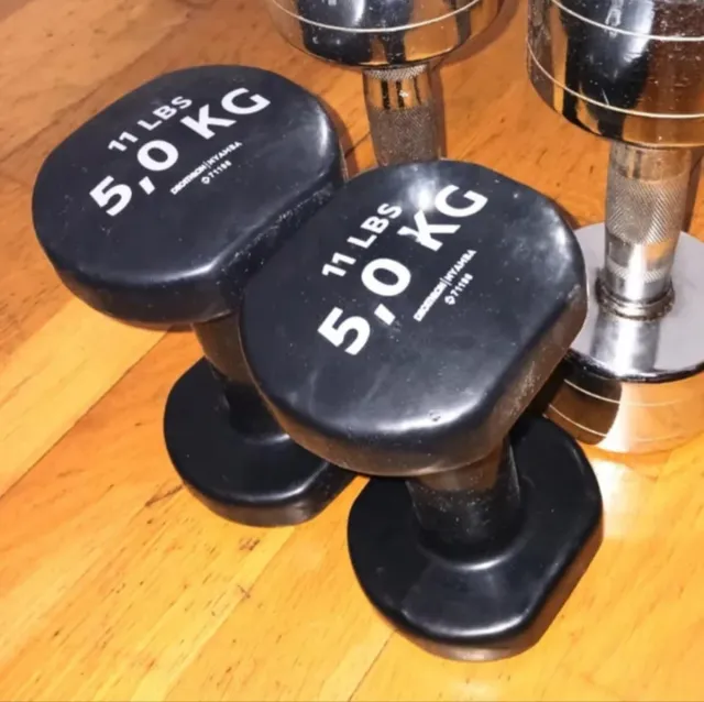 Par de mancuernas de 5 kg cada una, ideales para entrenamientos. - Peso: 5 kg (11 LBS). - Marca: Decathlon. - Color: Negro.