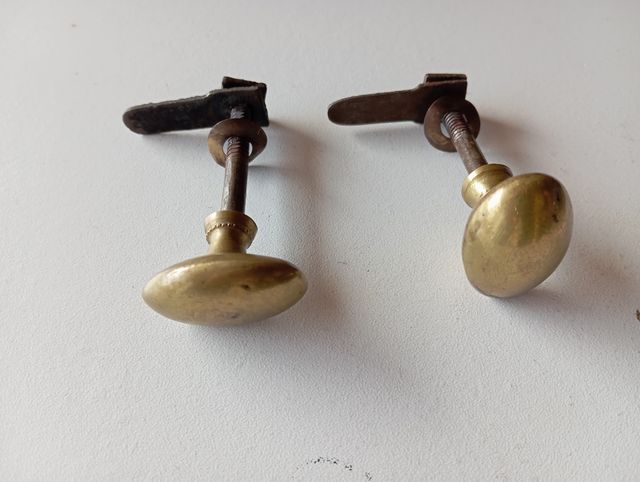 Detalles del producto2 tiradores de mesilla. Con pomos de latón en forma ovalada y pestaña para cerrar y abrir la puerta girando.