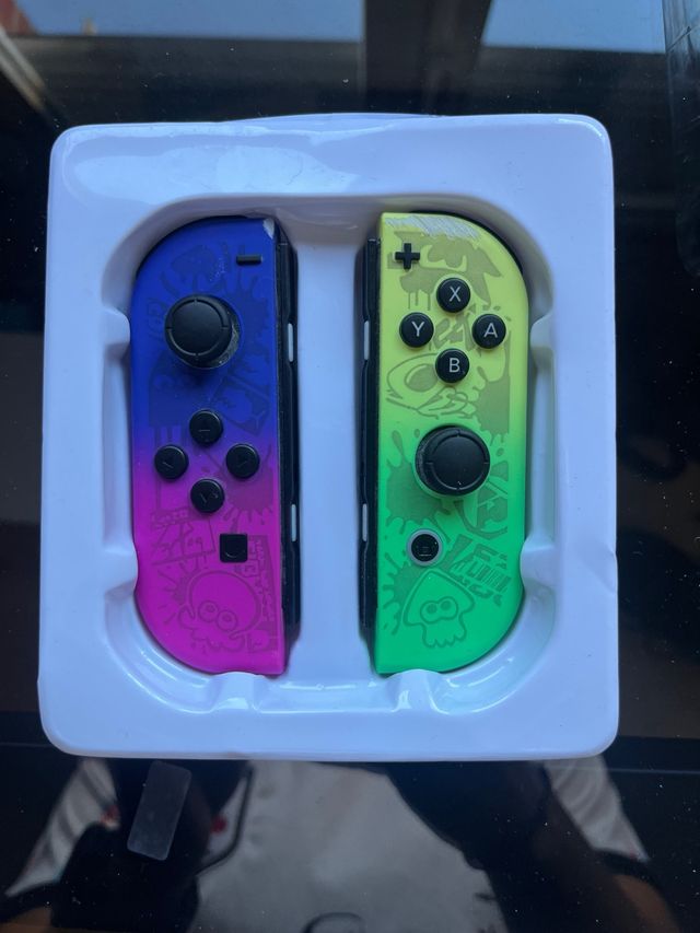 Detalles del productoPar de mandos Joy-Con para Nintendo Switch con un diseño degradado de morado a azul y de verde lima a verde.