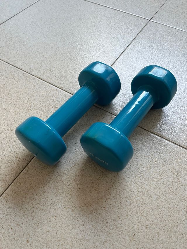 Detalles del productoPar de mancuernas recubiertas de neopreno, cada una con un peso de 2 kilogramos. Ideales para entrenamientos.