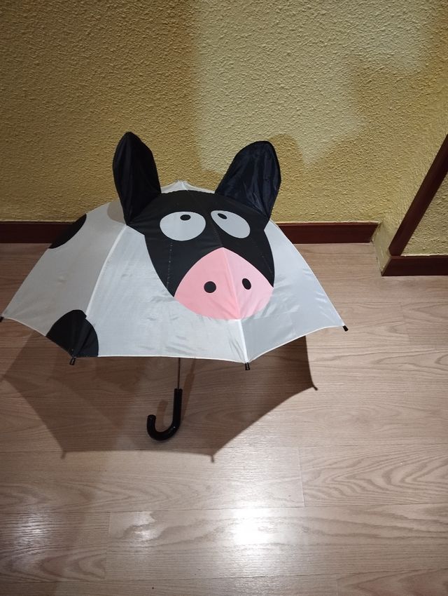 Tres paraguas pequeño para niñ@s con dibujo de vaca y la forma de dos orejas y dos con dibujo de rana y la forma de dos ojos.