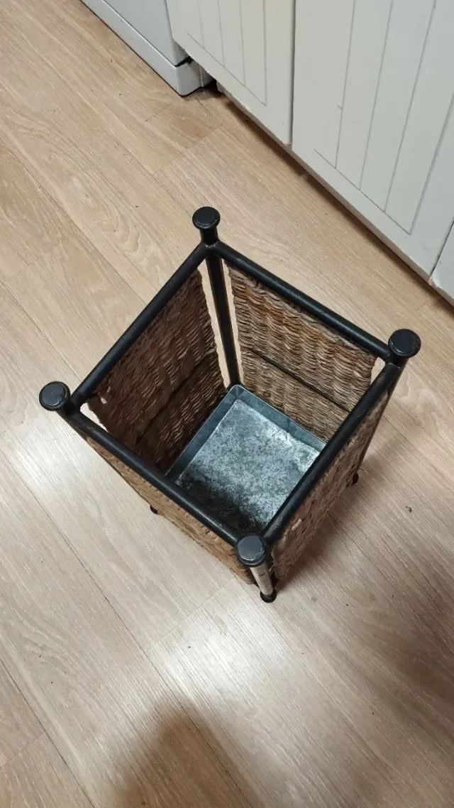 Detalles del productoParagüero con un diseño tejido y estructura metálica.