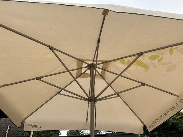 parasol grande de 2,5x2,5m, con estructura fuerte de acero y apertura facil con poleas, tela de color beige claro (con uso y algun pequeño daño en la lona) mas su base de acero grueso de 18kg. precio por unidad tengo 6 ud. NO negociable excepto si compra las 6 unidades (solo esta base ya cuesta 100€)
