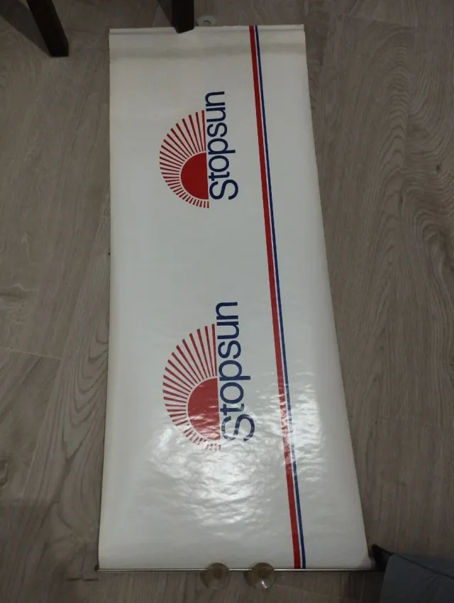 Parasol enrollable antiguo para coche. - Diseño con logo de StopSun. - Rayas rojas y azules. -130x45cm