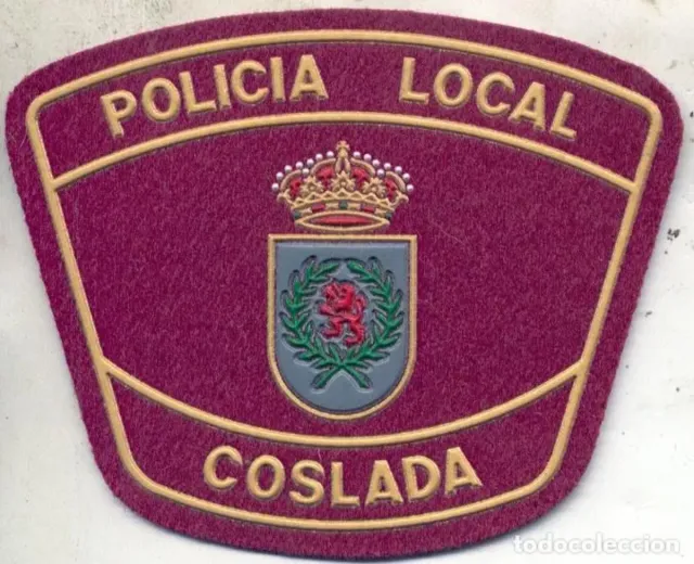 Parche de la Policía Local de Coslada, modelo antiguo. - Diseño con escudo y corona. - Borde dorado. - Color de fondo granate.