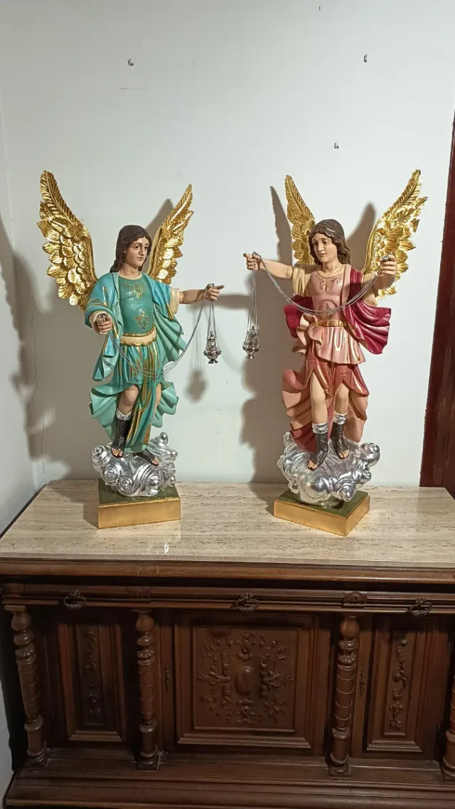 Detalles del productoMagnífica pareja de figuras de arcángeles en madera tallada, con incensarios, de 100 cm de altura. Estas impresionantes piezas aportarán un toque de solemnidad y belleza a tu espacio.Estucados en oro 22 Q.