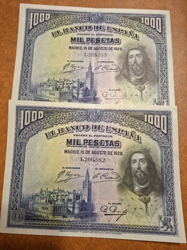 Detalles del productoSe venden dos billetes de 1000 pesetas del Banco de España, con fecha de 15 de agosto de 1928. Ligera doblez en centro que para nada afecta los billetes.