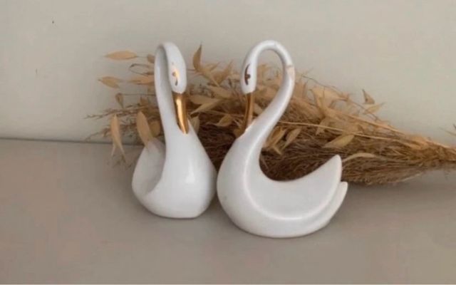 Detalles del productoElegante pareja de cisnes decorativos de porcelana blanca con detalles dorados.