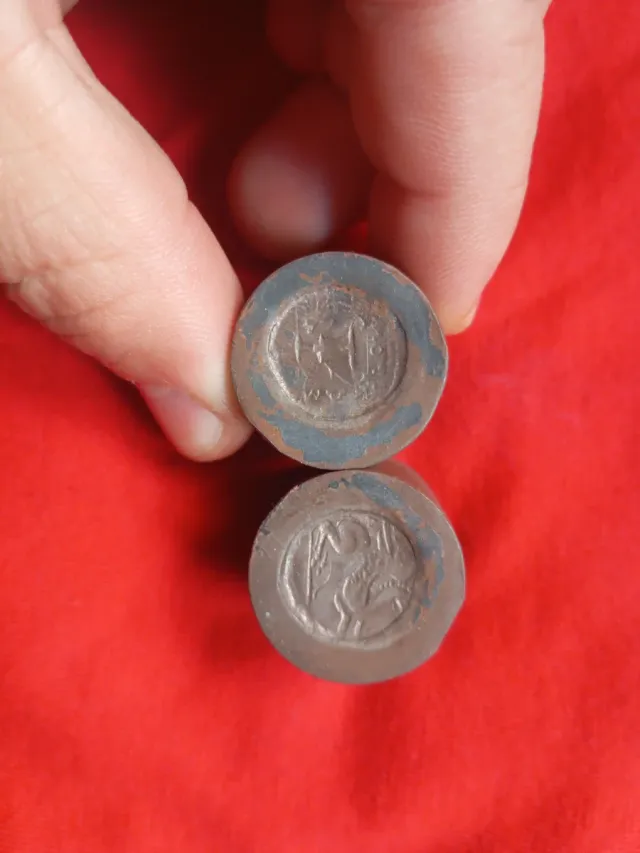 Conjunto de dos cuños de bronc compuestos de cara de anverso y reverso para hacer monedas íberas en cobre o otros materiales para monedas obolos griegos, oportunidad para personas que quieran usarlas con fines didacticos, enseñar en talleres medievales como se hacian monedas antiguamente, etc...