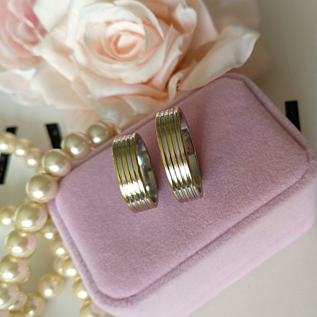 pareja de anillos/alianzas para pedida, compromiso a estrenar. De acero y oro 18 kilates Dísponibilidad de diferentes tallas. Se entregan con estuche