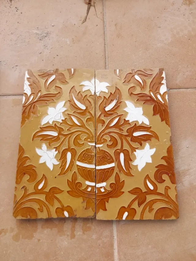 Conjunto de dos azulejos antiguos con un diseño floral y de jarrón. - Diseño en relieve. - Colores ocre, blanco y marrón.