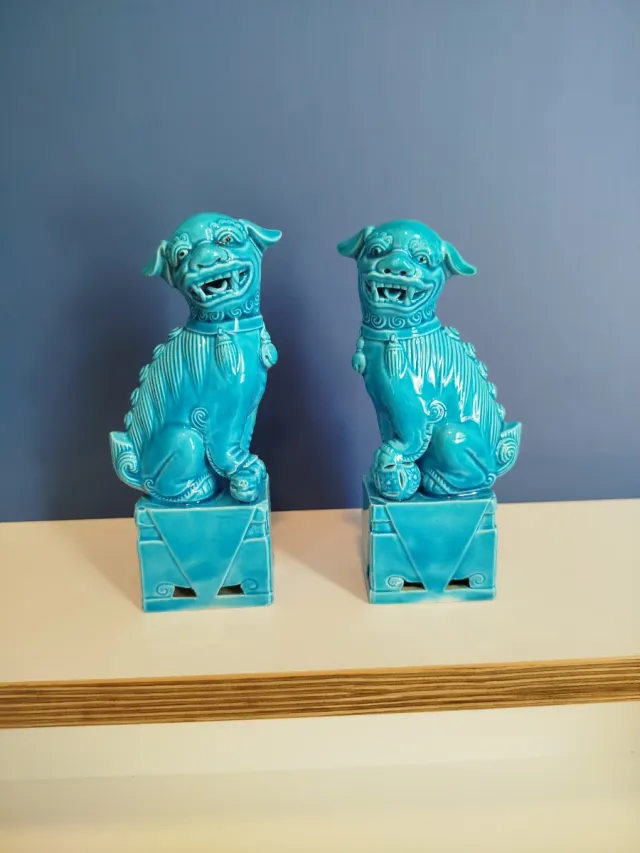 Detalles del productoPareja de perros foo o furia hechos en China con esmalte azul turquesa.