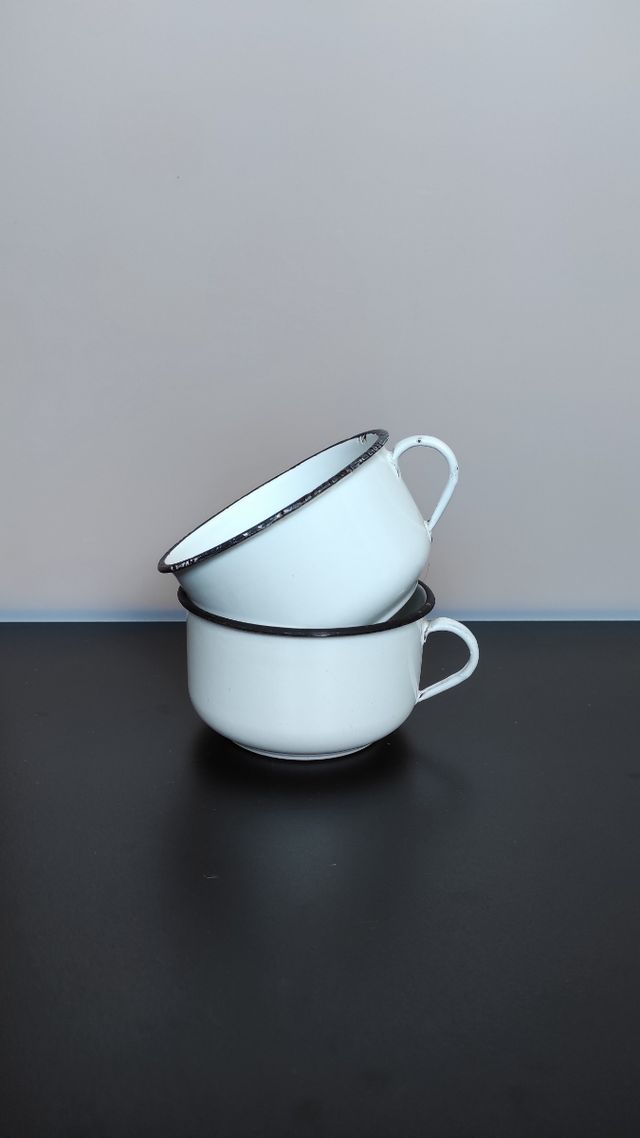 Detalles del productoConjunto de dos tazas antiguas de los años 50 de esmaltadas en blanco con borde negro. Ideales para decoración.