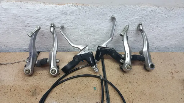 Se vende pareja de frenos de pinza para bicicleta. - Incluye manetas, cables y pinzas.